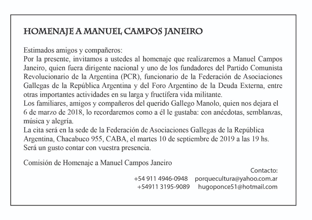 Por la presente, invitamos a ustedes al homenaje que realizaremos a Manuel Campos Janeiro, quien fuera dirigente nacional y uno de los fundadores del Partido Comunista Revolucionario de la Argentina (PCR), funcionario de la Federación de Asociaciones Gallegas de la República Argentina y del Foro Argentino de la Deuda Externa, entre otras importantes actividades en su larga y fructífera vida militante.